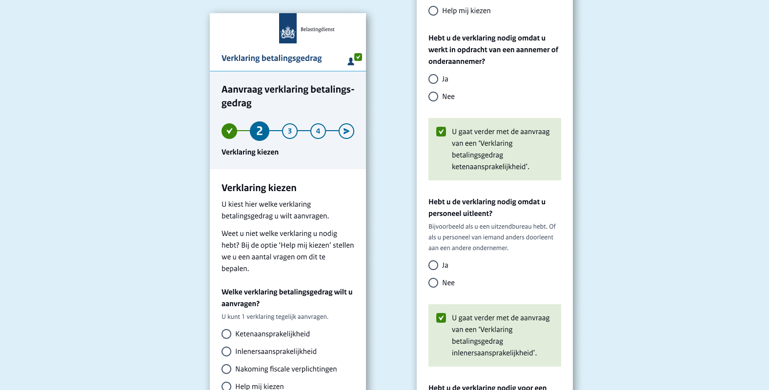 During the process the UX-team decided to generate 1 online form for the 3 different statements. As there are 3 different statements of payments, it was really difficult for the end-user to understand which statement had to be requested. By combining these into one online form, the digital application can guide the user with its decision. Users were able to navigate through the online form easily. Entrepreneurs are now able to close contract with companies much faster, due this digital product!
